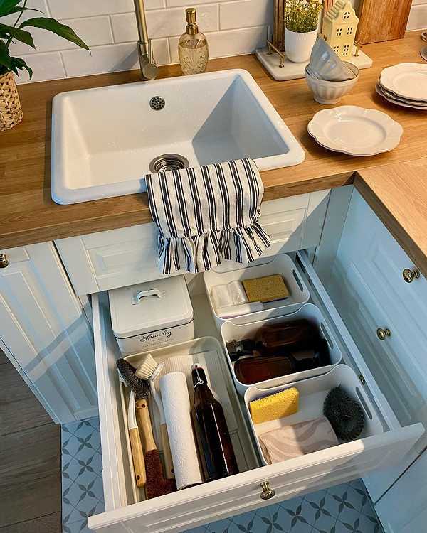 Частая проблема на маленьких кухнях — хаос в ящиках. Чтобы его упорядочить и вместить больше вещей, используйте контейнеры и органайзеры. Они помогают рассортировать губки и щетки, аксессуары для готовки и прочие мелочи. Выбирайте модели, которые легко мыть и переставлять. Тогда органайзеры не только сэкономят место, но и упростят уборку.