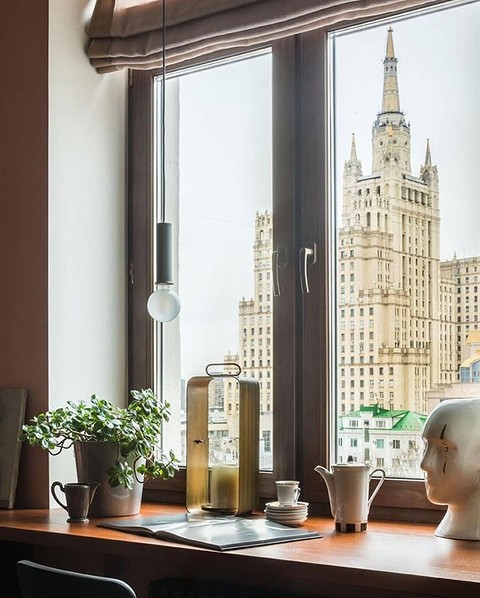 В этом проекте подоконник расширили и закрыли деревянной столешницей глубокого орехового цвета.