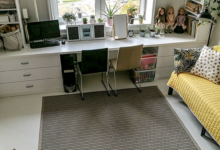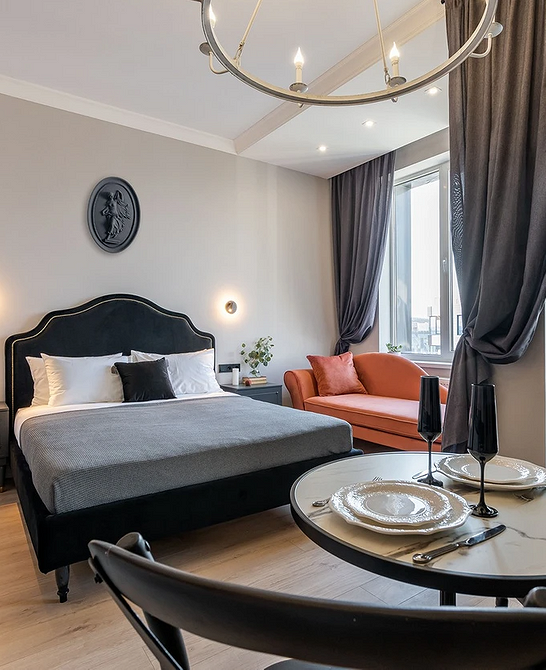 Зонирование может быть не только вертикальным, но и горизонтальным: например, когда функциональные зоны обозначают с помощью разной высоты потолка. Перепад уровней обычно выполняется из гипсокартона. Этот прием не уменьшает визуально высоту и ширину комнаты, а, напротив, подчеркивает геометрию пространства. Например, в этой студии таким образом обозначили зоны ТВ и отдыха.