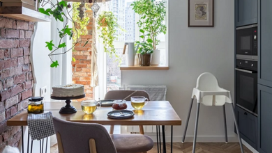 Подвесная колонна — еще одно нестандартное решение для зонирования. Верхняя часть конструкции крепится к потолку, а нижняя — к полу. Между ними остается пустота: это нужно, чтобы колонна не была монолитной и сохранялось ощущение единого пространства. Можно пойти дальше и добавить перегородке функциональности: так, здесь дизайнер прикрепила к верхней части поворотный телевизор. Его можно смотреть из любой зоны — кухни, гостиной или спальни. А в низ колонны встроен биокамин.