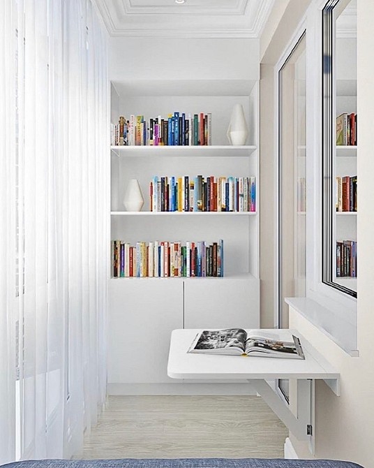 Открытый балкон может стать замечательной летней библиотекой. Продумайте защиту от комаров и освещение, чтобы читать можно было и в темное время суток. На утепленной лоджии проще организовать небольшую библиотеку. А если лоджия соединена с одной из комнат, уединенный уголок устроить еще легче: поставьте небольшой стеллаж и добавьте уютного текстиля.