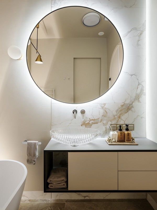 В этом проекте под долгосрочную аренду объединились сразу несколько трендов, благодаря чему пространство выглядит современно и стильно, но в то же время спокойно. В ванной внимание сразу привлекает прозрачная раковина-чаша, изготовленная из стекла. В сочетании с мягким локальным освещением, светлой отделкой и деликатными текстурами она выглядит красиво и необычно. Смеситель монтировали на стену — так смотрится гармоничнее.