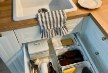 Дополнить белые фасады таким же фартуком — почему бы и нет? В этом проекте Анастасия Уфимцева выбрала искусственный камень белого цвета с серыми прожилками. Кухню делает нескучной цвет стен — сложный розовый. А нотку роскоши добавляют золотистые ручки на фасадах нижних шкафов и такой же золотой трековый светильник.