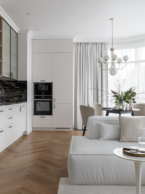 Контраст — всегда выигрышное решение. В этом проекте дизайнер Елена Лебедева подобрала черный камень с активным рисунком для фартука. Черный цвет поддержан ручками на фасадах, встроенной бытовой техникой в колонне — духовым шкафом и микроволновой печью, а также мойкой и смесителем. В столовой зоне — черный обеденный стол, который тоже перекликается с кухней.