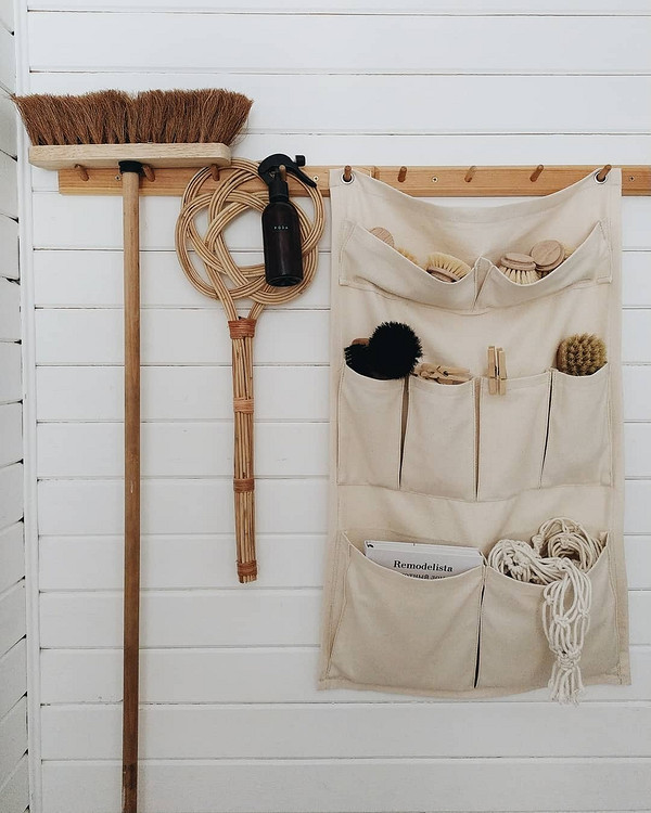 В этом примере задействовали сразу два вида настенного хранения. В основе — длинная настенная вешалка с крючками. На нее повесили крупные инструменты для уборки. Здесь же — вместительный органайзер с кармашками. В них сложили щетки, прищепки, губки, авоськи — то, что часто требуется в быту, но сложно организуется для хранения. «Станция» для бытовых приспособлений получилась не только удобная, но еще стильная — за счет бежевых оттенков, натуральных материалов (деревянная вешалка, хлопковый органайзер).