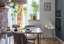 Эти небольшие апартаменты предназначены для сдачи в аренду. На 22 кв. м разместили жилую зону с двуспальной кроватью и туалетным столиком, столовую группу и компактную, но оснащенную всем необходимым кухню. Между гарнитуром и кроватью — символическая стеклянная перегородка, чтобы визуально разделить комнату. Апартаменты находятся в историческом доме, поэтому внутри решено было сохранить атмосферу старины. В этом помогли лепнина на стенах и потолке, винтажная мебель (шкаф, стулья и вписанный в гарнитур буфет), хрустальная люстра и соответствующий декор. Палитра получилась насыщенной: в качестве одного из основных оттенков взяли малиновый, для акцента — черный.