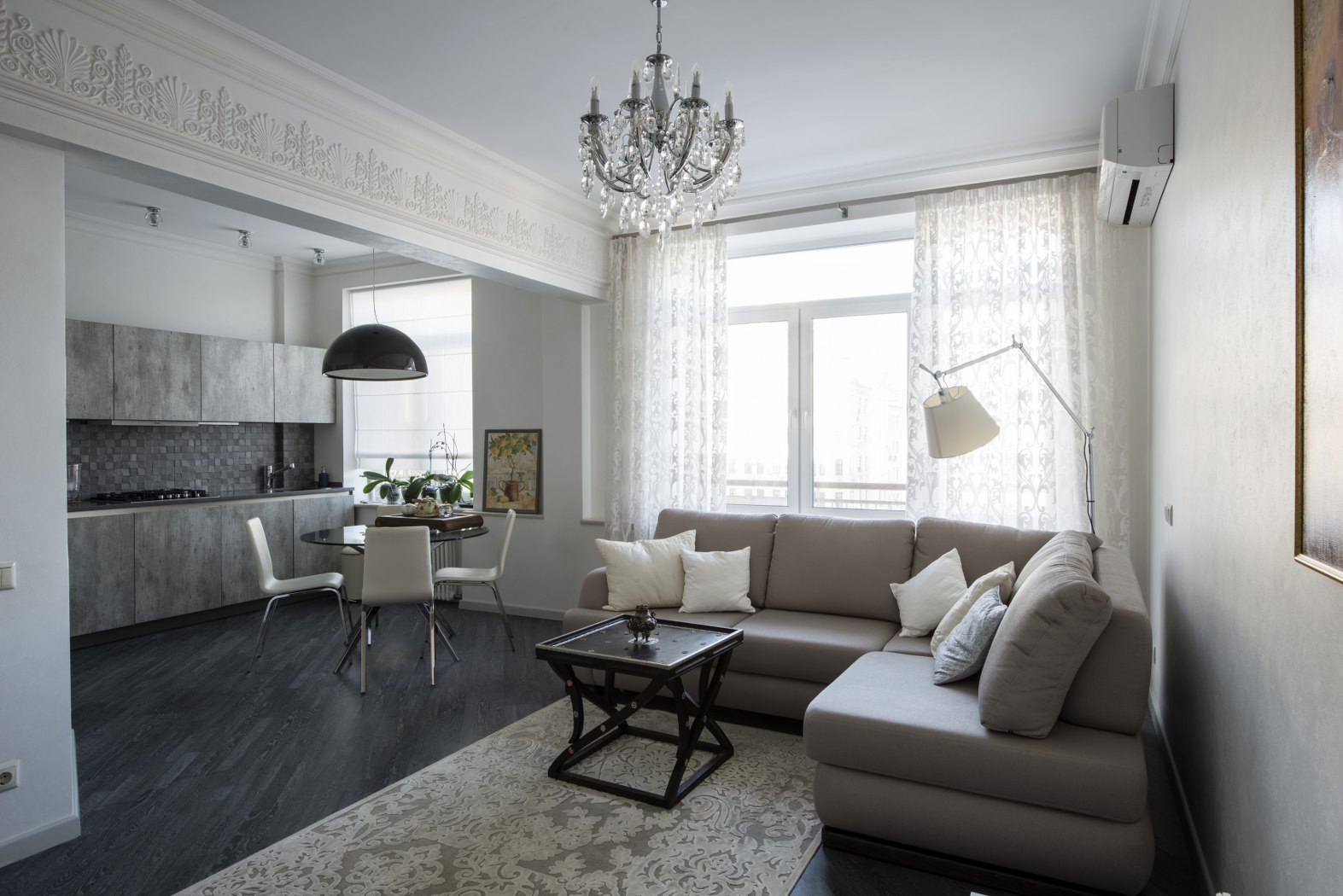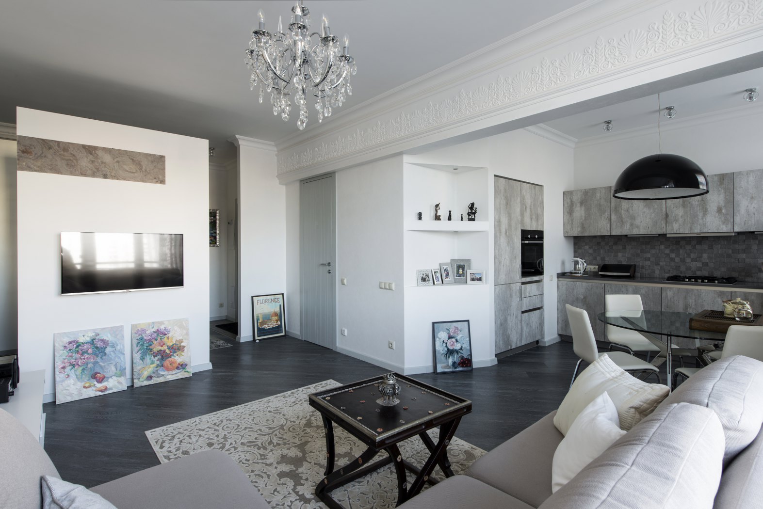 Для начала архитектор «избавилась» от старых перегородок — всё разрешённое к сносу было демонтировано. Изначально изолированные и «сообщающиеся» посредством узкого коридора гостиная, кухня и прихожая архитектор преобразовала в единую студию. От ранее имеющейся ненесущей стены в этом объёме осталась только потолочная балка, украшенная лепным фризом.