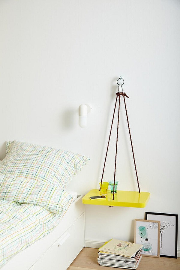 Подвесная мебель практична, потому что не занимает место на полу, а еще визуально выглядит легче. Многие предметы можно сделать своими руками: например, прикроватный столик в спальню. Причем не обязательно присверливать его к стене. Например, подвесьте на крючок, как на фото. Для этого проделайте в столешнице несколько отверстий и закрепите в них прочные жгуты. При помощи карабинов скрепите их вместе на металлическом кольце и уже на него подвешивайте к стене. А вместо яркой столешницы можно взять нейтральную из массива дерева и покрыть ее лаком или морилкой.