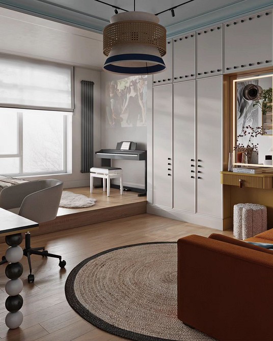 В этой комнате для девочки сочетаются продуманное зонирование и тонкая декораторская работа. Разнообразие цветов необходимо детям для гармоничного развития, и здесь их хватает: спокойную бело-коричневую базу разбавляют сложные оттенки красного, желтого, синего, голубого. Для контраста — серый и черный, которые уравновешивают нейтральные и акцентные цвета. Планировка также продумана до мелочей: есть несколько систем хранения, уголок для отдыха, туалетный столик с зеркалом, рабочее место для учебы. А у окна — подиумная часть с кроватью, зоной для занятий музыкой и проектором, который заменяет телевизор.